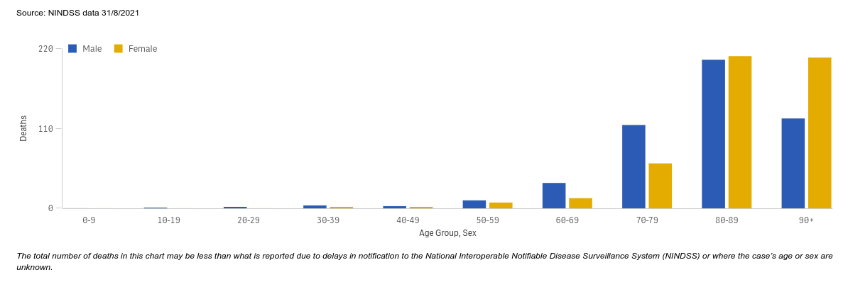 2. Average Age of Death of Sufferers of COVID-19 The Australian Government Website, provides a graph of the age and gender of the people dying from COVID-19 in Australia. It is 86+ years of age for females and 82+ years of age for males. Very few young people are dying from this disease and those that are have other life-threatening medical conditions. In addition to this, none of those that have died received any effective therapeutic drugs during the 1st week of their infection. A study conducted, in 2021, by Israel, found that, all persons who suffer this disease and get well are likely to have life-long immunity significantly superior to that which is conferred by any of the present vaccines. Most young people don't even realise they have had the disease. As stated above, the IFR for this disease is around 5 times less dangerous for young, medically fit persons than is the case with common influenza. |
