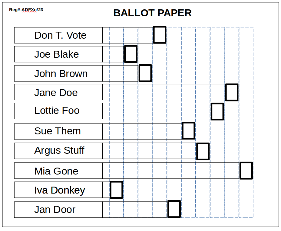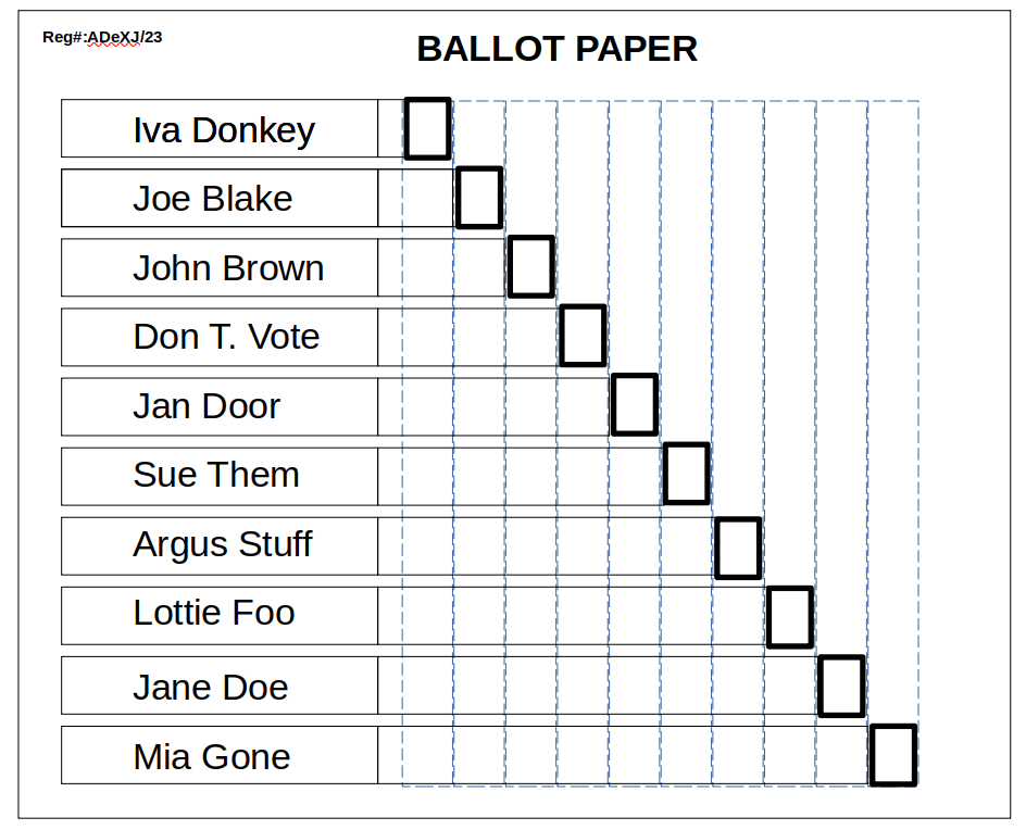 - Ballots Should List Candidates in Random Order. Candidates should appear on the ballot in random order such that each ballot when being issued is different to the one that preceded it and this continues until all the permutations and combinations of the presentation order of these candidates is expended, at which point, the cycle repeats. For example if there are 10 candidates on a ballot, the total number of permutations and combinations would be 10x9x8x7x6x5x4x3x2x1=3,628,800 different orders of presentation of candidates so, in this case, 3,628,800 ballots would be issued until the first ballot issue repeats itself. This would eliminate the effect of the "Donkey Voter" as well as the uninterested, apathetic voter. Because Digital Printing Technology is, now, no more expensive than offset printing, printing names on ballots in a random sequence is both practical and economical. Some people have (rightly) opined that doing this would make counting of the ballots difficult. There are a number of ways this difficulty could be overcome. Fig 1 shows a ballot where candidates are listed in an orderly fashion with boxes for each candidate being in a specific column. Fig 2 shows a ballot where the order of presentation of the candidates has been jumbled. In both cases, the candidate's box appears in the same column. This makes counting simpler both for people and for tabulation machines should the latter be used. (On the matter of machines, I am very much opposed to voting on line or the use of machines for tabulation where the latter's detailed operation cannot be randomly and frequently checked in real time by scrutineers as the machine performs its counting function. In both instances it is possible for a person knowledgeable in Computer Science to defraud the system in such a manner that detection of that fraud is almost impossible to detect. A further problem with on-line voting is that one cannot be absolutely sure the person casting the vote is indeed the person on the voting roll nor that the person has not been induced or coerced to vote in a certain way. There is no substitute for in-person secret voting at a properly run polling station on the day of the election with all voters providing an approved ID to establish they are who they say they are.)