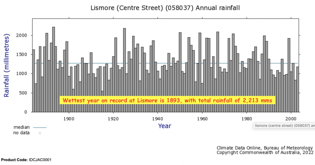 Lismore Annual Rainfall Record. Similarly the historical data from Lismore shows rainfall remaining the same or decreasing ever so slightly.