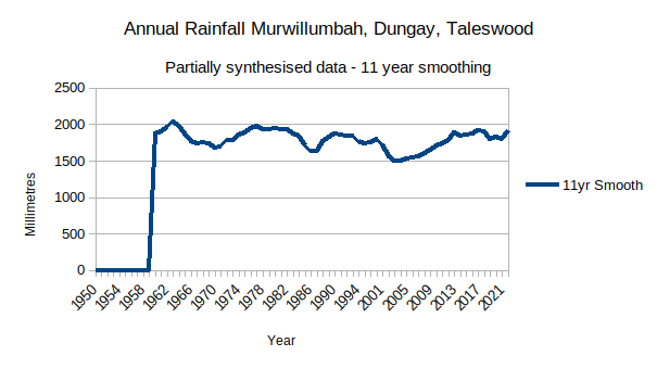 Murwillumbah Annual Rainfall Record. To the right is a graph (Fig 2.) of annual rainfall from 1951 to 2021 in the Murwillumbah region where the Bureau of Meteorology has a rain measuring station. You can see that, if anything, rainfall has tapered off slightly.