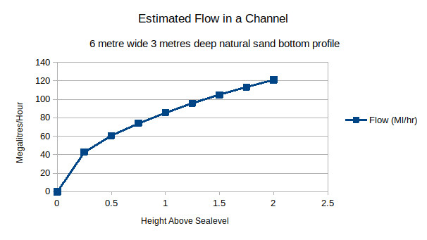 Construct “Circuit Breakers” – Diverting Flood Waters Directly to Ocean. Figure 8 provides an estimate of the flow that could be expected in an open channel cut through the sand in a canefield. Figure 9 shows a map of the Ballina area. At the top right hand corner is the Ballina township. In the middle bottom is the town of Broadwater with the Richmond River flowing almost parallel to the coast line from Broadwater to Ballina. From the River at opportune points, where culverts exist under River Drive, it would be possible to bulldoze & dredge sizeable canals running directly to the sea. On the coastline, these canals could terminate in concrete pipes which would lead out into the ocean. At each end of the canal could be flood gates and sumps with trash-grates for maintenance. These flood gates would allow, as the present gates in that area already do, a means for draining the land for the benefit of agriculture (and hence the farmers that own that land). Circuit Breaker # 1 (CB#!) builds on an existing creek, “Boundary Gully Creek”. Likewise CB#2 is in the area of “Swampy Creek” and so it goes. If these flooding circuit breakers were installed, not only would it be to the benefit of landowners, it would also allow flood waters to escape to the ocean before reaching Ballina township.