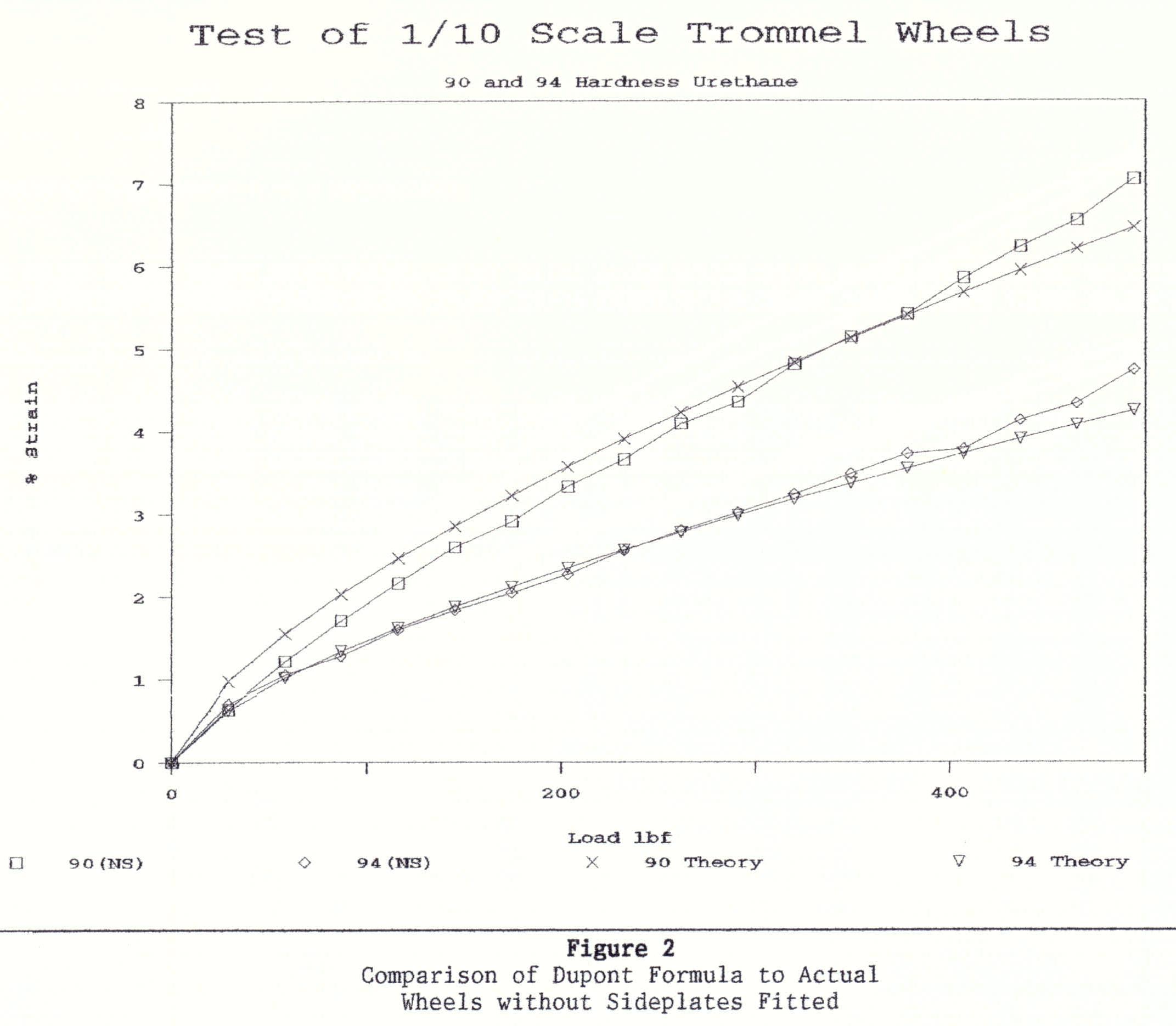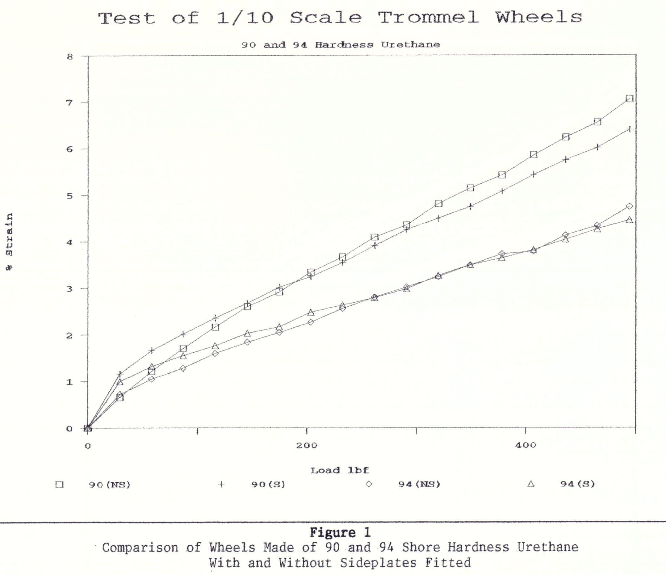 Readings of Lismore made four wheels for me using urethane with of 90 and 94 shore hardness.  Two wheels, one with 90 and the other with 94 shore hardness, were fitted with side plates.  The other two were without side plates.  The idea of the side plates was to examine what happened to the urethane if side expansion was restricted.  In the end, it was found that the side plates were not necessary to reduce the distortion of the urethane.  Before proceeding with the test, I gave to the Mining Manager, Graham Jacques, a graph of the expected deformation.  After the tests, I overlaid the test results on the graph.  They matched almost precisely.  Graham Jacques was delighted because as previously he loved to prove Mainland Engineering Group wrong.
